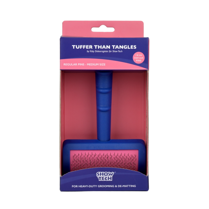 Step into the world of superior grooming with the original Tuffer Than Tangles professional slicker brush by Show Tech. Crafted with precision and care by Kitty Dekeersgieter, a renowned expert in pet grooming, this brush stands as a testament to innovation and quality in pet care. As the first of its kind on the market, Tuffer Than Tangles set the standard for professional grooming tools, with many attempting to replicate its success but none matching its performance.